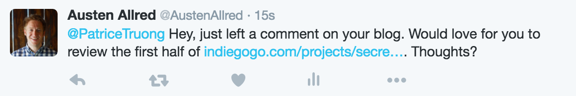 Observe como eu o segui no Twitter para que seja obviamente pessoal e não um comentário automático de spam. Eu até exagerei um pouco e twitei para ele apenas por diversão.